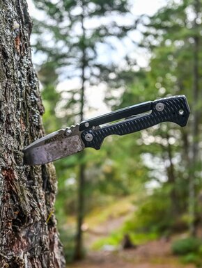 Клинок типу Drop Point із сталі S35VN. Подібне поєднання вважається найбільш універсальним користувачами, тому що може вирішувати широкий спектр завдань. Викид клинка можливий однією рукою завдяки шпенікам у формі зрізаного конуса з рифленням. На обусі присутні фальшльоз та насічка для упору великого пальця.