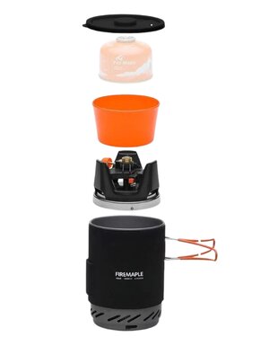 Пальник оснащений ручкою регулювання для контролю сили горіння полум'я, п'єзоелектричним запалюванням і ніпелем, для запобігання втрати палива при зміні балонів. Всі складові складаються всередину казанка разом зі 110 грамовим газовим балоном.