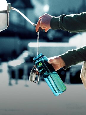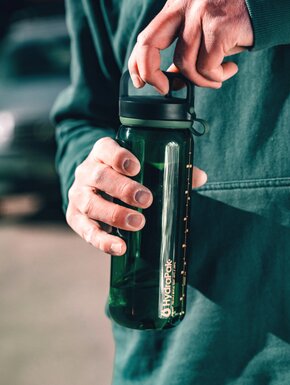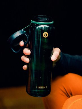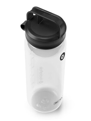 Кришка щільно загвинчується, оснащена кутовою ручкою для кріплення та перенесення, а тонкий профіль пляшки дозволяє легко тримати її в руках, поміщати в кишеню рюкзака або опускати в підсклянку.