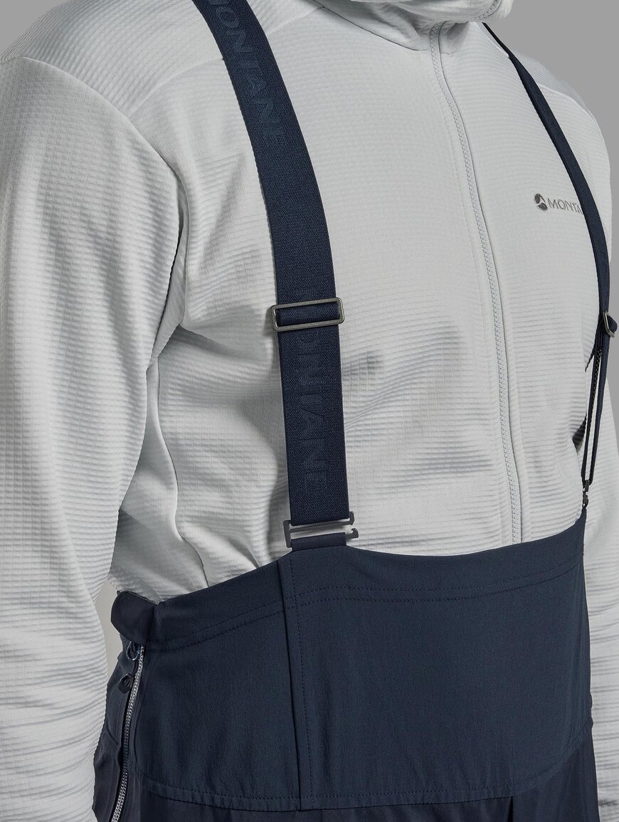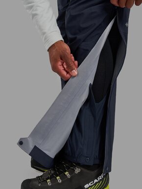 Штани оснащені повнорозмірними двосторонніми блискавками YKK Aquaguard, що дозволяють швидко вдягати їх поверх взуття та забезпечують вентиляцію. Регульований низ штанин з внутрішніми гетрами щільно закриває взуття й запобігає потраплянню снігу або бруду. Знімні підтяжки гарантують стабільну посадку, а бічна кишеня на блискавці зручна для зберігання дрібних речей.