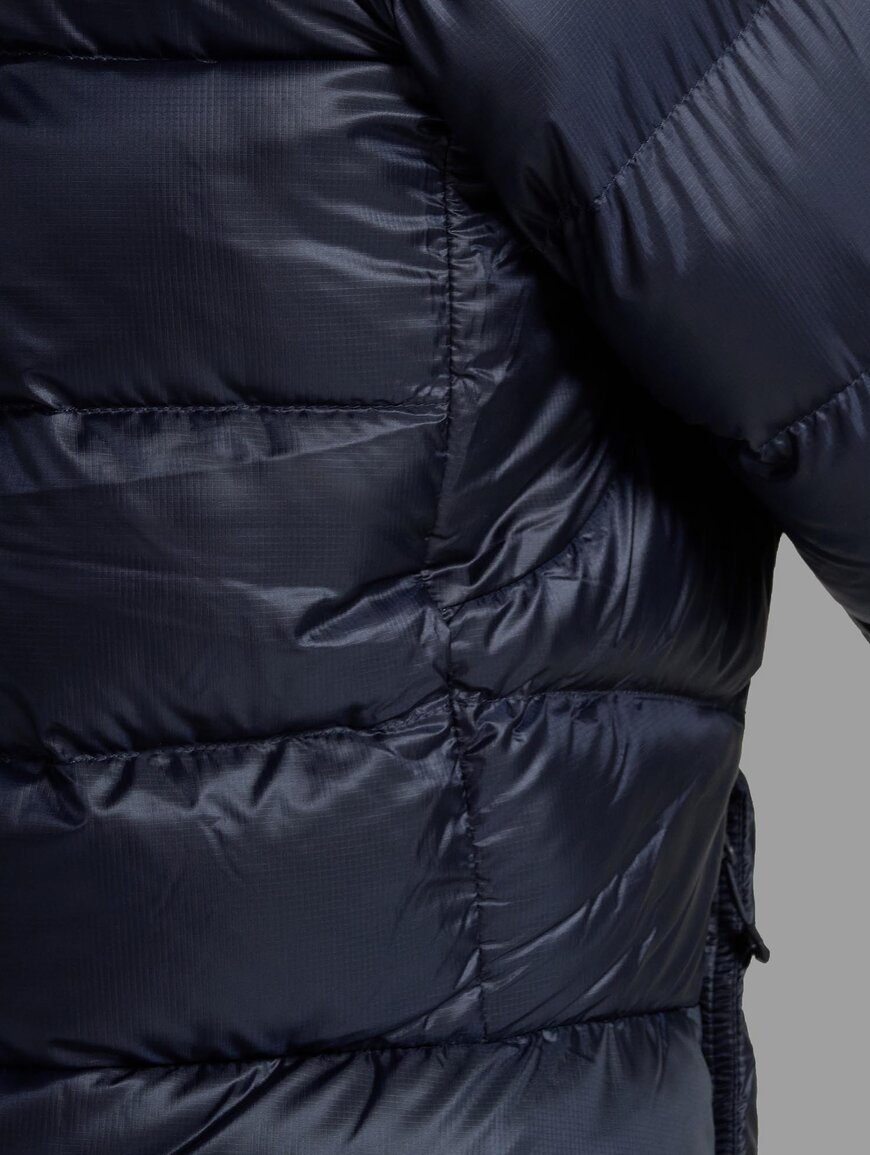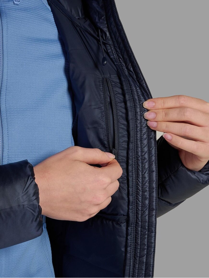 Зовнішній матеріал Pertex® Quantum виготовлена з переробленого нейлону, має водостійке покриття без PFAS і добре захищає від вітру. Утеплювач - високоякісний сертифікований пух ExpeDRY 800 FP (90/10) з водовідштовхувальним просоченням, який утримує тепло навіть після намокання та висихає швидше, ніж звичайний пух. Камерна конструкція рівномірно розподіляє пух і запобігає появі холодних зон.