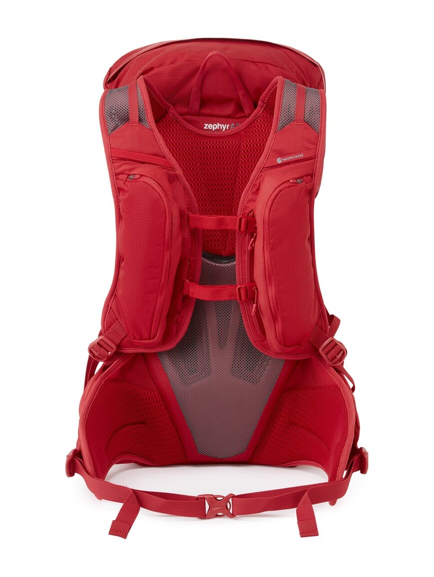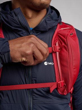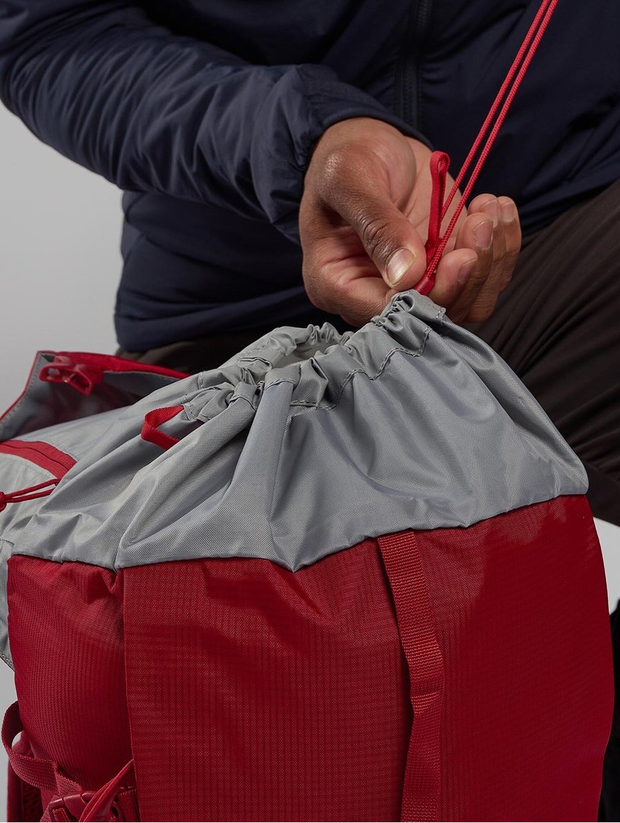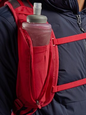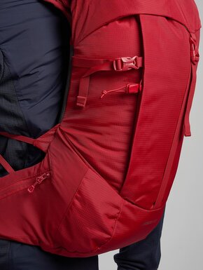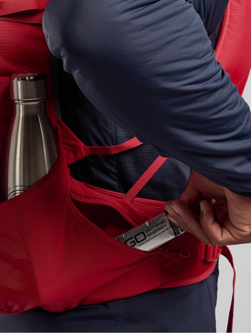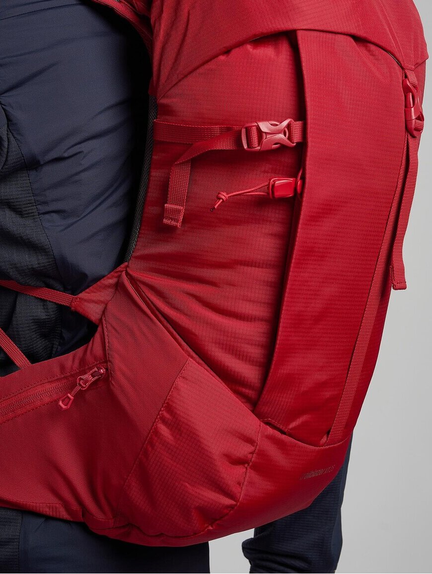 Є багато зручних кишень: бокові на блискавках для пляшок, кишені на лямках для фляг чи перекусу, а також передня кишеня для речей, до яких потрібен швидкий доступ. Система T-hook дозволяє кріпити додаткове спорядження зовні. Рюкзак сумісний із питною системою та має кріплення для трекінгових палиць або льодоруба.
