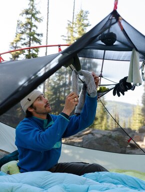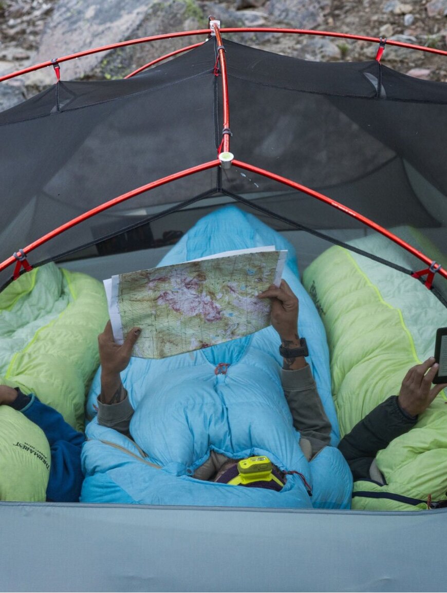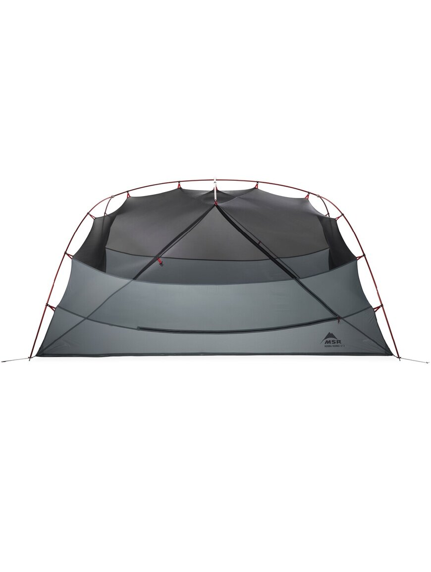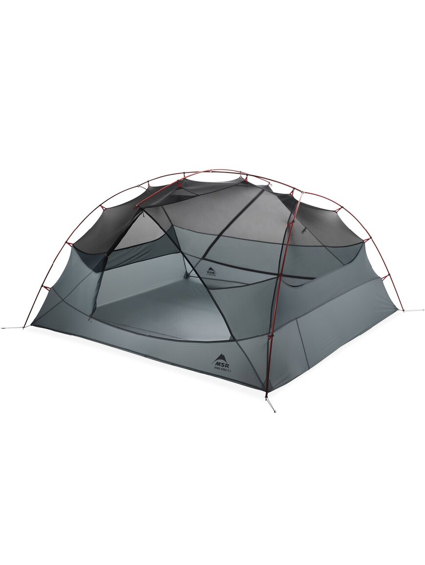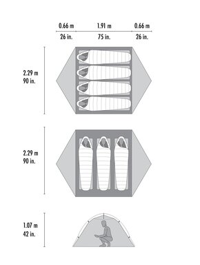 Намет MSR Hubba Hubba LT 3 важить лише 1,98 кг, що робить його одним із найлегших рішень для повноцінного проживання трьох людей. Головна перевага моделі — прямокутна підлога без звуження. Це дозволяє вільно експериментувати з розміщенням: всередині легко поміщаються три широкі килимки або до чотирьох стандартних. Висота стелі 1,07 м та майже вертикальні стінки забезпечують достатньо місця, щоб вся група могла вільно сидіти всередині.