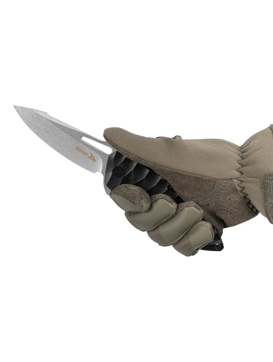 Руків'я виготовлено з матеріалу G10, відмінно лежить навіть у вологій руці або рукавичках. Є кліпса, яку можна зняти та користуватися темляком, під який передбачено отвір.