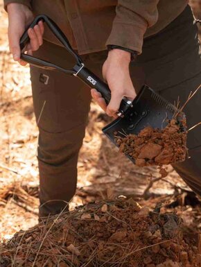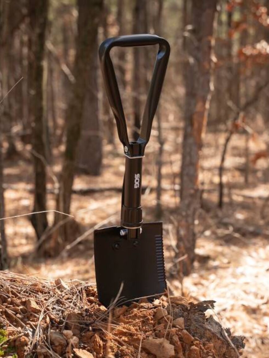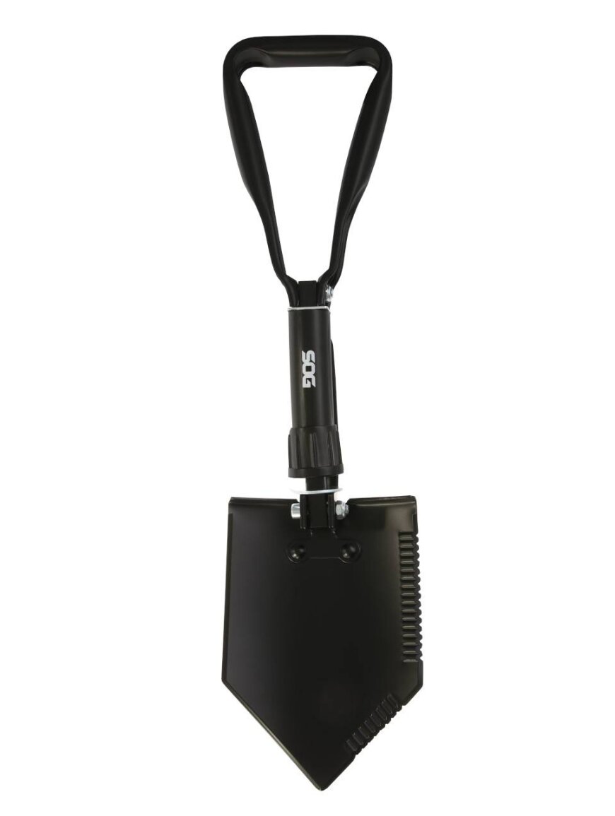 Складана лопата від SOG виготовлена з міцної високовуглецевої сталі для тривалої роботи в складних умовах. Вона має загартоване сталеве лезо з гострими зубцями та чорним порошковим покриттям. Ця лопата відмінно підходить для копання, а її лезо також здатне рубати гілки дерев та інші матеріали. Унікальне трикутне руків'я забезпечує зручний хват та додаткову міцність під час копання багаття, чищення табору або підготовки до непередбачуваних ситуацій.