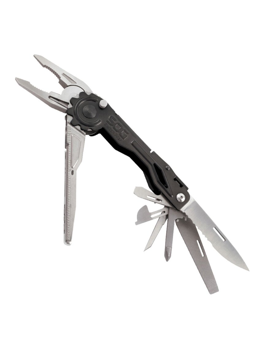 - включає: ніж з частковим серрейторним заточуванням, кусачки для дроту, викрутки, відкривачки, шило, напилок, лінійка