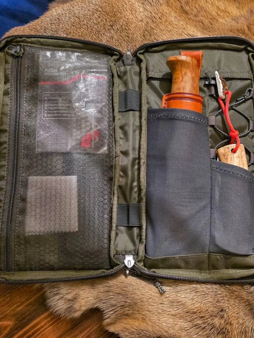 Чохол для інструментів з міцного матеріалу Cordura® призначений для використання в наборі bushcraft. Він підходить для розміщення ножа з фіксованим лезом (максимальна довжина леза 12 см), кишенькового ножа, мультитула, паракорду, кресала та засобів заточування, при цьому наповнення можна змінювати відповідно до власних потреб. Конструкція має м'яку підкладку та повністю відкривається завдяки круговій блискавці, що забезпечує зручний доступ до вмісту. Додатково передбачені блискавки, що замикають, для підвищеної безпеки.