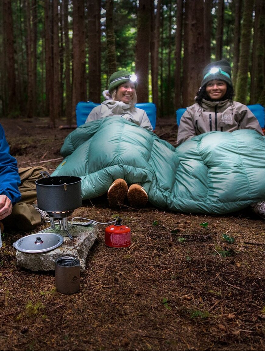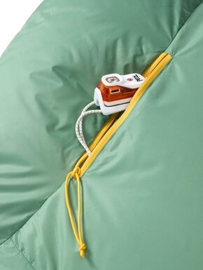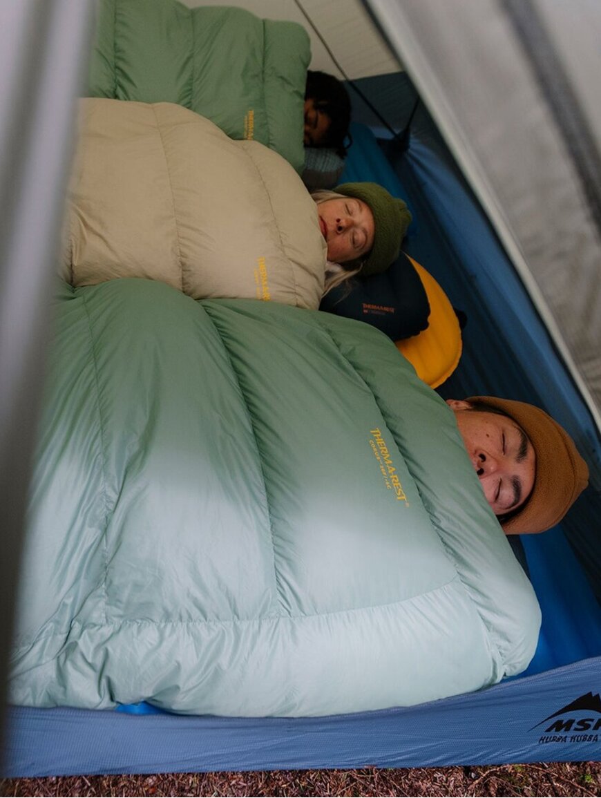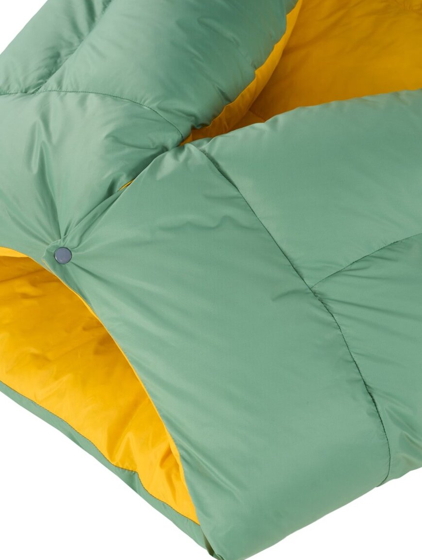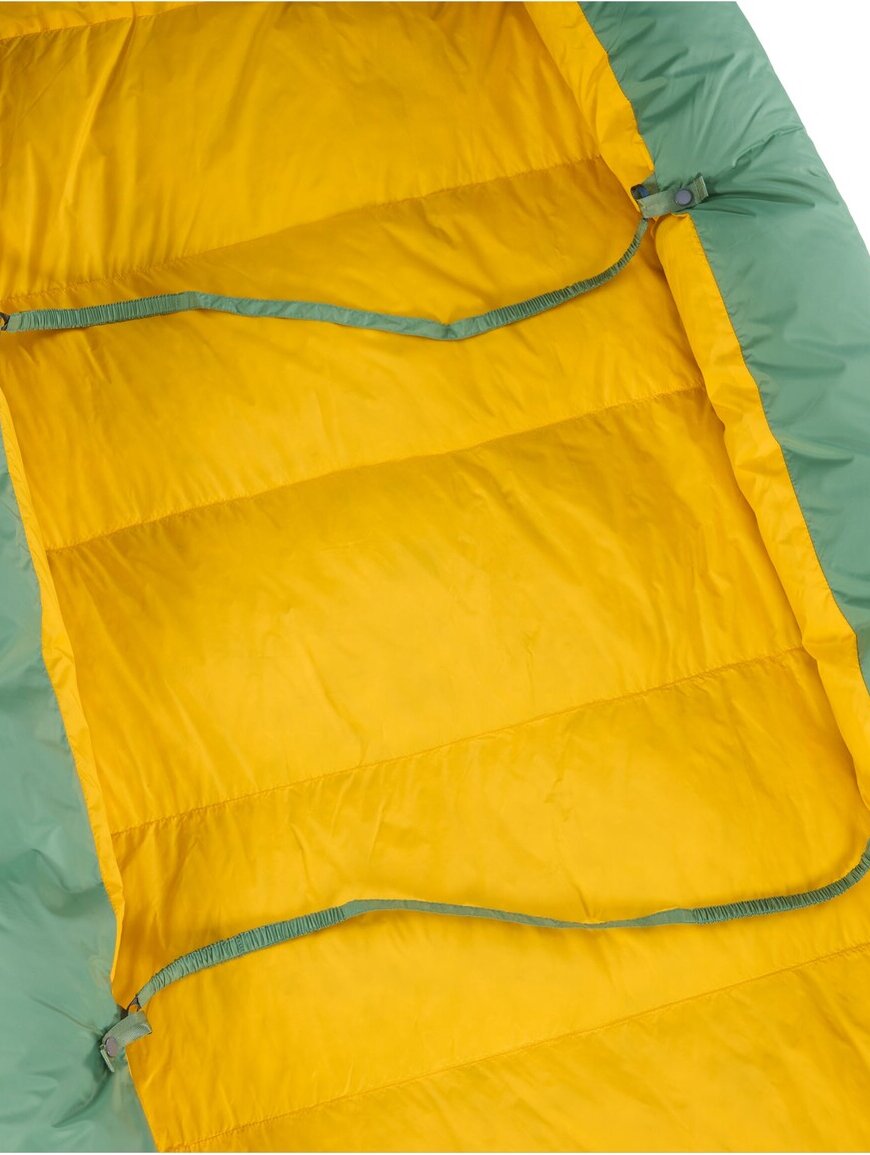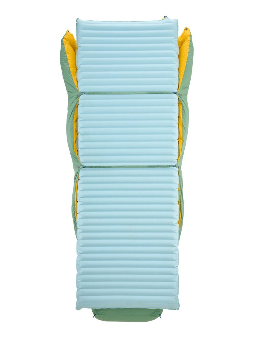 Система кріплень SynergyLink™ дозволяє зафіксувати квілт на килимку, щоб він не змііщувався під час рухів. Зона ніг (footbox) має продуману форму: її можна натягнути на килимок для захисту від протягів або використовувати як утеплену кишеню для стоп. Бічні перегородки по периметру та застібка на шиї допомагають утримувати тепло.