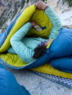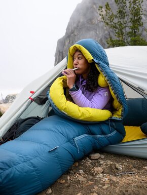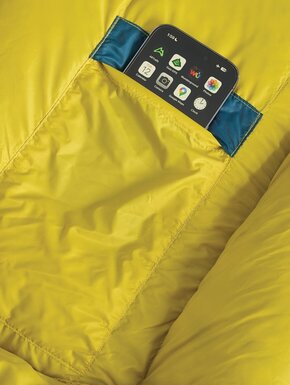 Оновлена структура внутрішніх перегородок та система Zoned Insulation дозволяють зосередити основну масу утеплювача в зонах найбільших тепловтрат. Гідрофобна обробка пуху захищає його від вологи та конденсату, дозволяючи спальнику залишатися пухким і тримати тепло навіть під час тривалих виходів. Для швидкого зігрівання ніг усередині передбачена спеціальна утеплена кишеня Toe-asis™. Температурні показники спальника: комфорт: 0°C; ліміт: -6°C