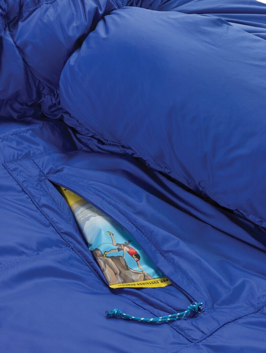 Зовнішня тканина та підкладка виготовлені зі 100% переробленого нейлону з водовідштовхувальним покриттям без вмісту PFAS. Широкі утеплювальні планки вздовж блискавок перекривають одна одну, унеможливлюючи появу «холодних зон». У комплект входять компресійний мішок та сітчастий чохол для зберігання.