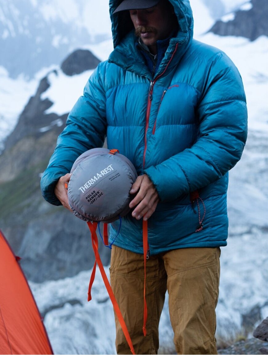 Спальник THERM-A-REST Polar Ranger -30C Regular розроблений спільно з полярним дослідником Еріком Ларсеном для використання в умовах екстремального холоду. Утеплювачем слугує качиний гідрофобний пух 800-fill, який зберігає теплоізоляційні властивості навіть у вологому середовищі та ефективно стискається для транспортування. Вага моделі складає 1,48 кг, що є високим показником для спорядження такого температурного режиму.