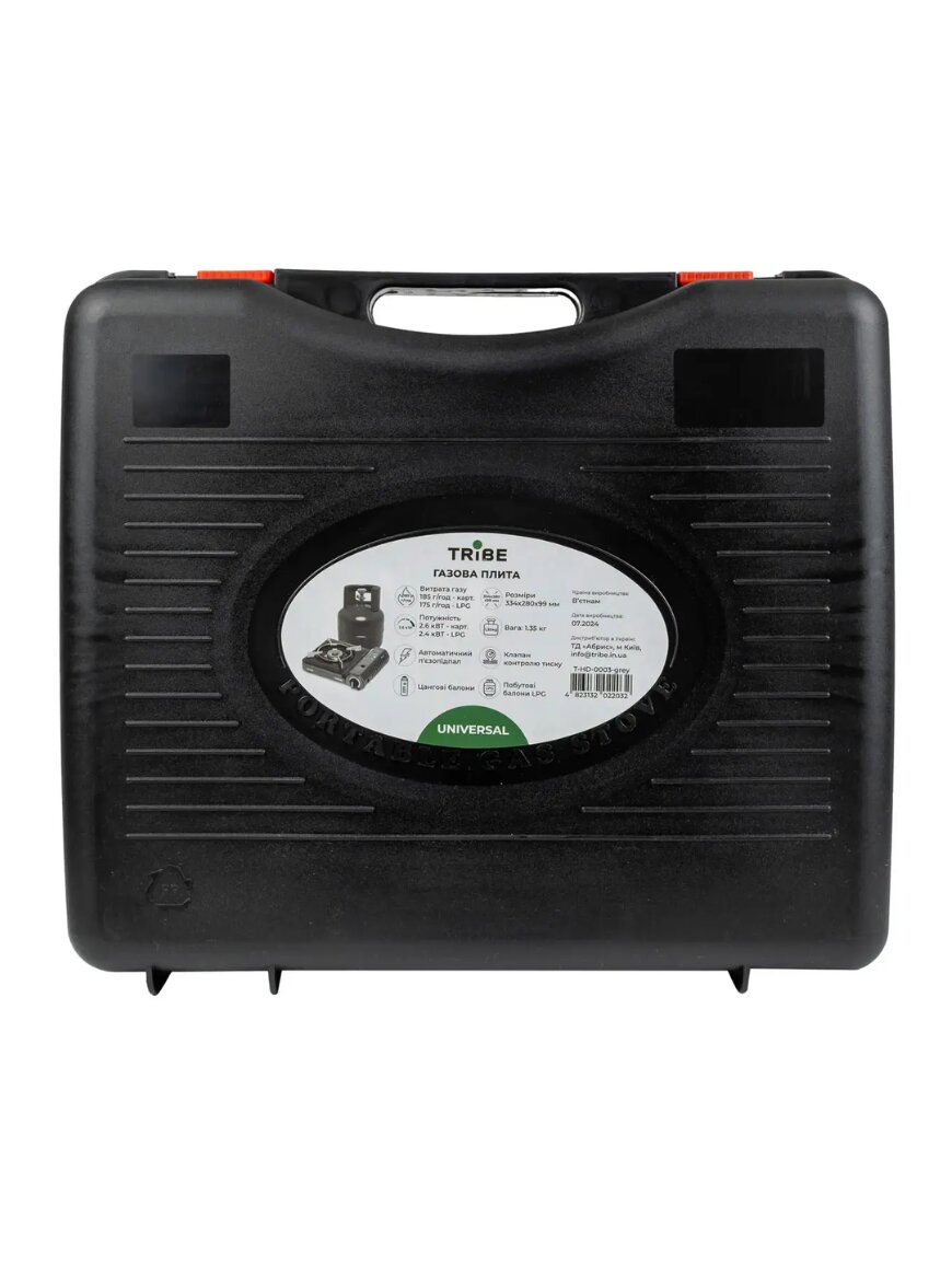 Міцна підставка підходить для розміщення посуду різного розміру – від невеликих кухлів до об'ємних каструль. Такий дизайн забезпечує стійкість та зручність експлуатації. Плита комплектується перехідником для підключення до LPG балона, а також пластиковим кейсом для зручного транспортування та захисту під час зберігання.