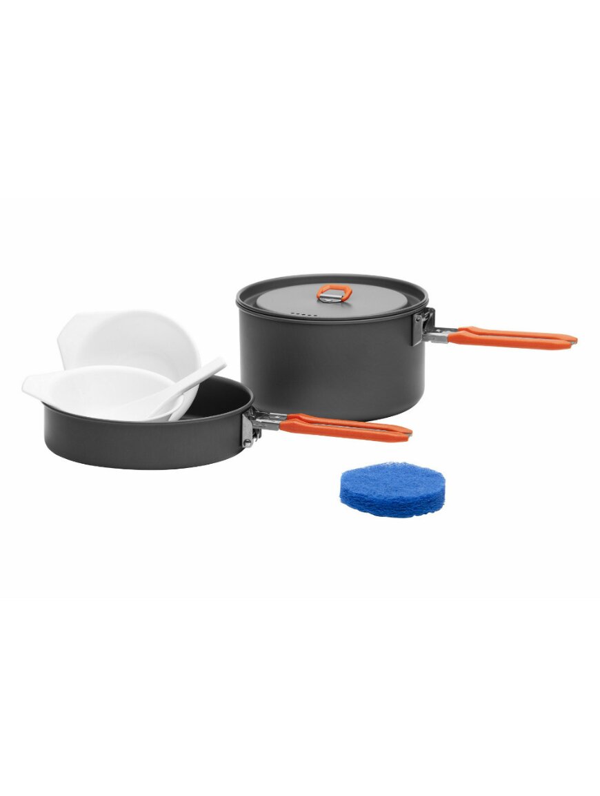 Кастрюля и сковорода изготовлены из анодированного алюминия, обеспечивающего прочность и долговечность посуды. Сковорода объемом 600 мл и котелок на 1 литр позволят приготовить разнообразные блюда на горелке.