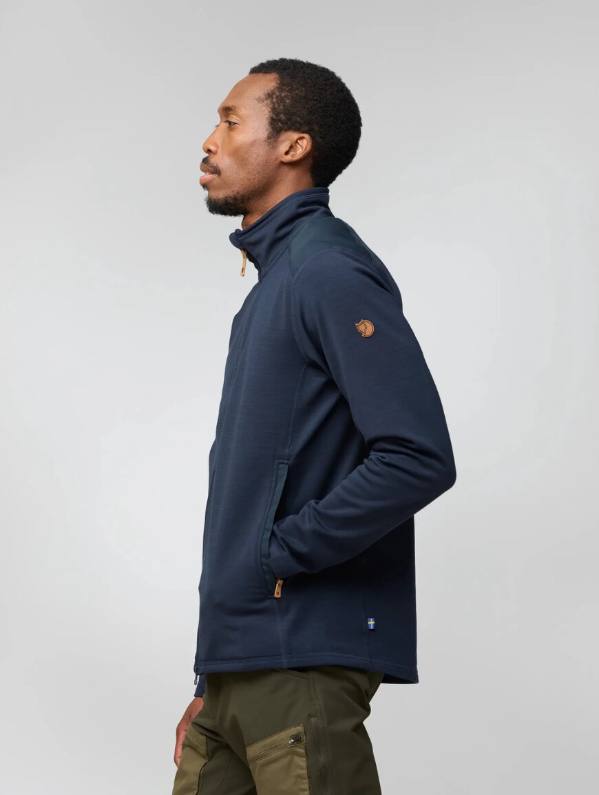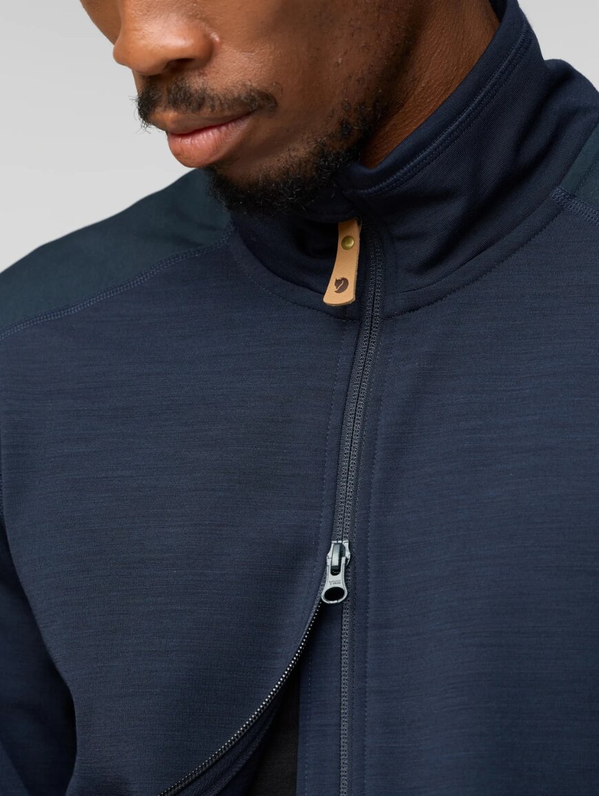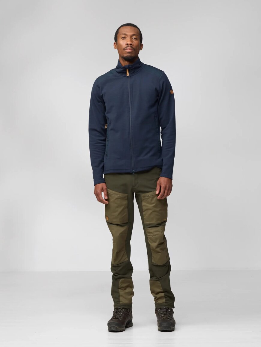 FJALLRAVEN Keb Fleece M - это комфортная мужская флисовая кофта, созданная на основе популярной модели с капюшоном Keb Fleece Hoodie. Благодаря сочетанию шерсти, переработанного полиэстера и эластана она хорошо удерживает тепло, отводит влагу и приятно ощущается на теле. Плечи усилены прочной тканью G-1000, что делает кофту более устойчивой к износу, особенно при ношении рюкзака. Полноразмерная молния, удобные карманы для рук и плоские швы добавляют практичности в использовании. Эта кофта одинаково хорошо работает как легкий верхний слой в теплое время года, так и как средний утепляющий слой зимой.