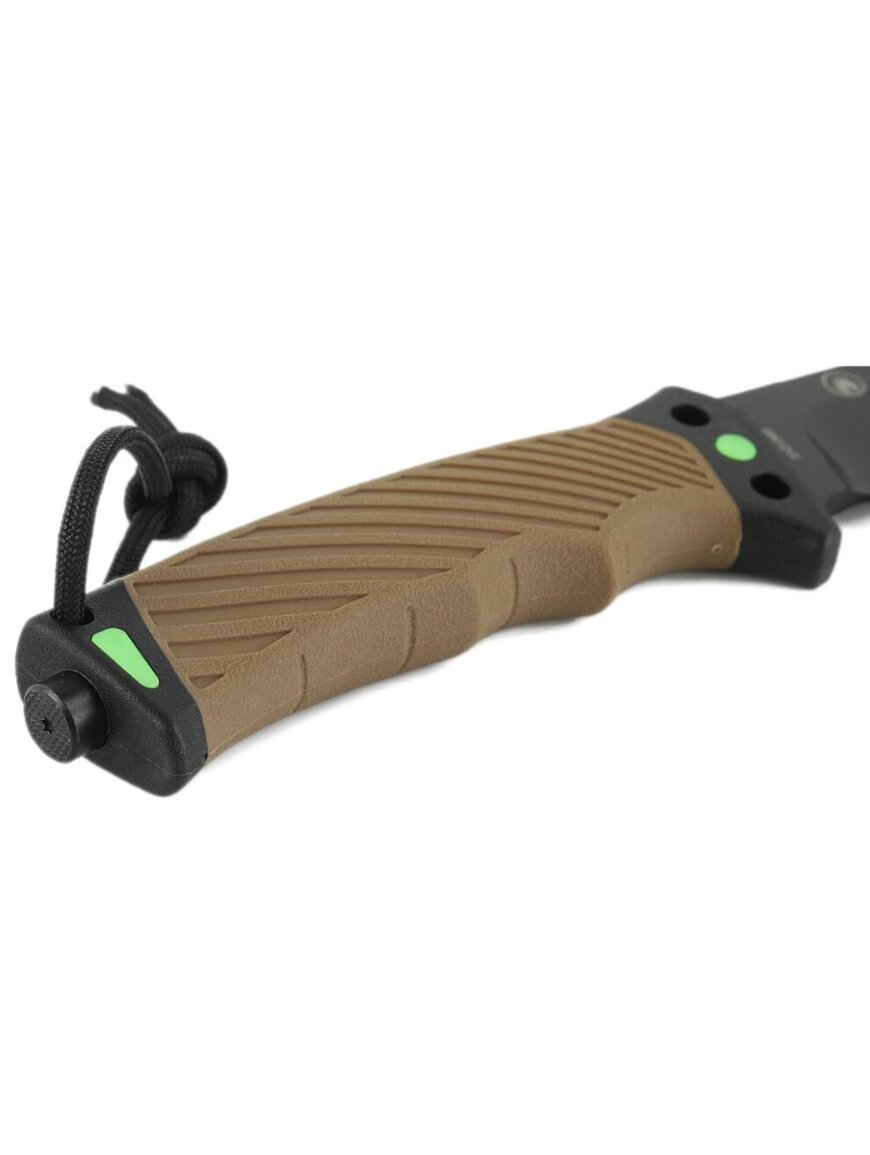 Этот нож хороший пример надежного инструмента, который не боится сложных задач. Его клинок изготовлен из высокоуглеродной стали 8CR13 с твердостью 58 HRC, сочетающей качества, которые необходимы настоящему ножу для выживания. Благодаря высокому содержанию хрома, сталь невосприимчива к появлению коррозии и имеет продолжительный срок службы. Режущая кромка надолго сохраняет свою остроту и эффективно работает даже с твердыми сортами древесины, что пригодится во время отдыха на природе. За счет ширины клинка, которая равна 5 миллиметрам, достигается повышенная надежность инструмента при интенсивных и длительных нагрузках. Клинок с прямой заточкой имеет темное матовое покрытие, которые скрывает небольшие царапины на лезвии.