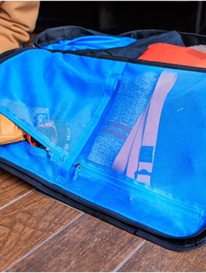 На одном из торцов есть расширяющийся карман для “грязного снаряжения”, чтобы изолировать использованные вещи от остального багажа. Внутри – компрессионные ремни для фиксации содержимого и внутренние сетчатые карманы для организации мелочей. Надежные ручки по бокам и снизу делают подъем или перенос сумки простой даже при полной загрузке.