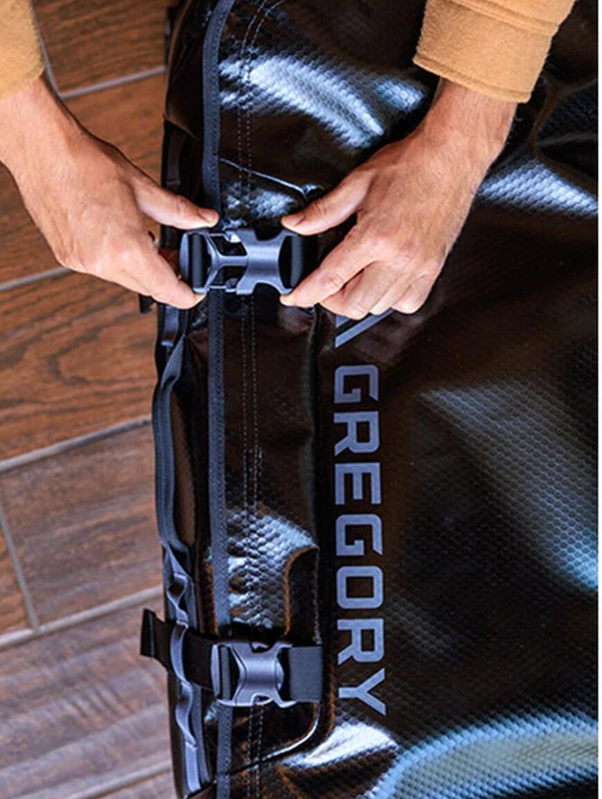 Дорожная сумка на колесах с объемом 100 литров, созданная для длительных поездок и перевозки большого снаряжения. Прочная конструкция сочетает сверху ткань из переработанного полиэстера с TPU-покрытием и крепкое дно из поликарбоната, что выдерживает удары и нагрузки. Телескопическая алюминиевая ручка вместе с большими колесами (85 мм) обеспечивает легкое передвижение, а форма U-окна с полноценной молнией дает удобный доступ к содержимому.