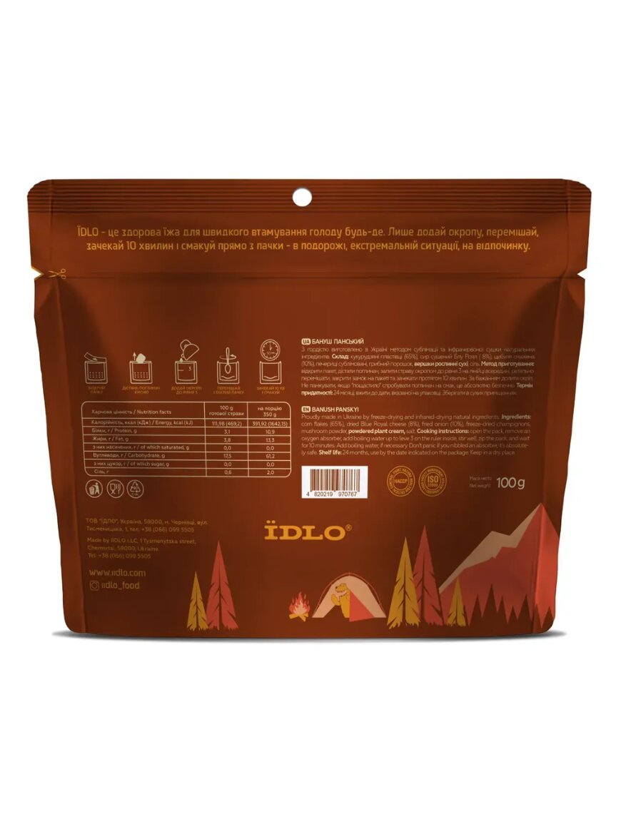 Состав: кукурузные хлопья (65%), сыр сушеный Блу Роял (8%), лук жареный (10%), шампиньоны сублимированные, грибной порошок, сливки растительные сухие, соль.