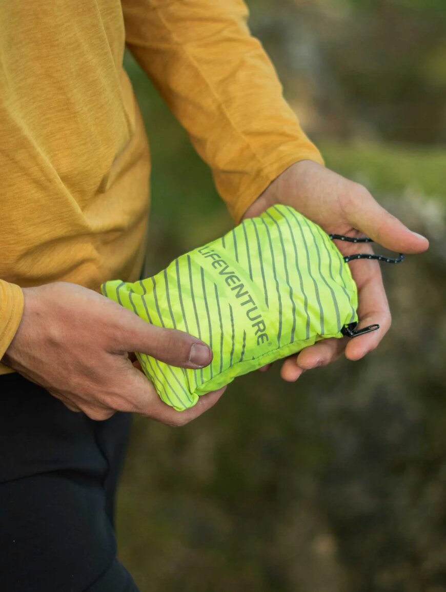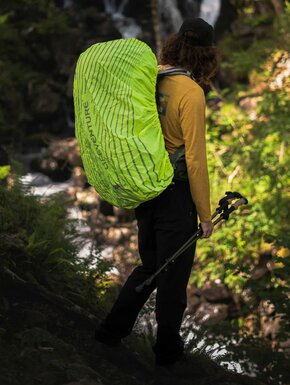 Чехол для надежной защиты рюкзака и снаряжения объемом 55-70 л от дождя и влаги во время походов, путешествий или повседневного использования. Изготовлен из прочной водонепроницаемой ткани и оснащен светоотражающим принтом, который повышает видимость в условиях слабой освещённости. Чехол крепится к лямкам рюкзака, что предотвращает его смещение при ходьбе. Регулируемый шнурок позволяет плотно зафиксировать чехол и обеспечивает надёжную посадку даже в ветреную погоду.