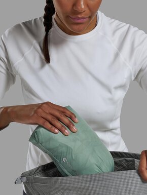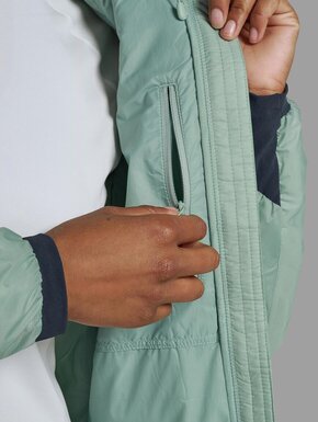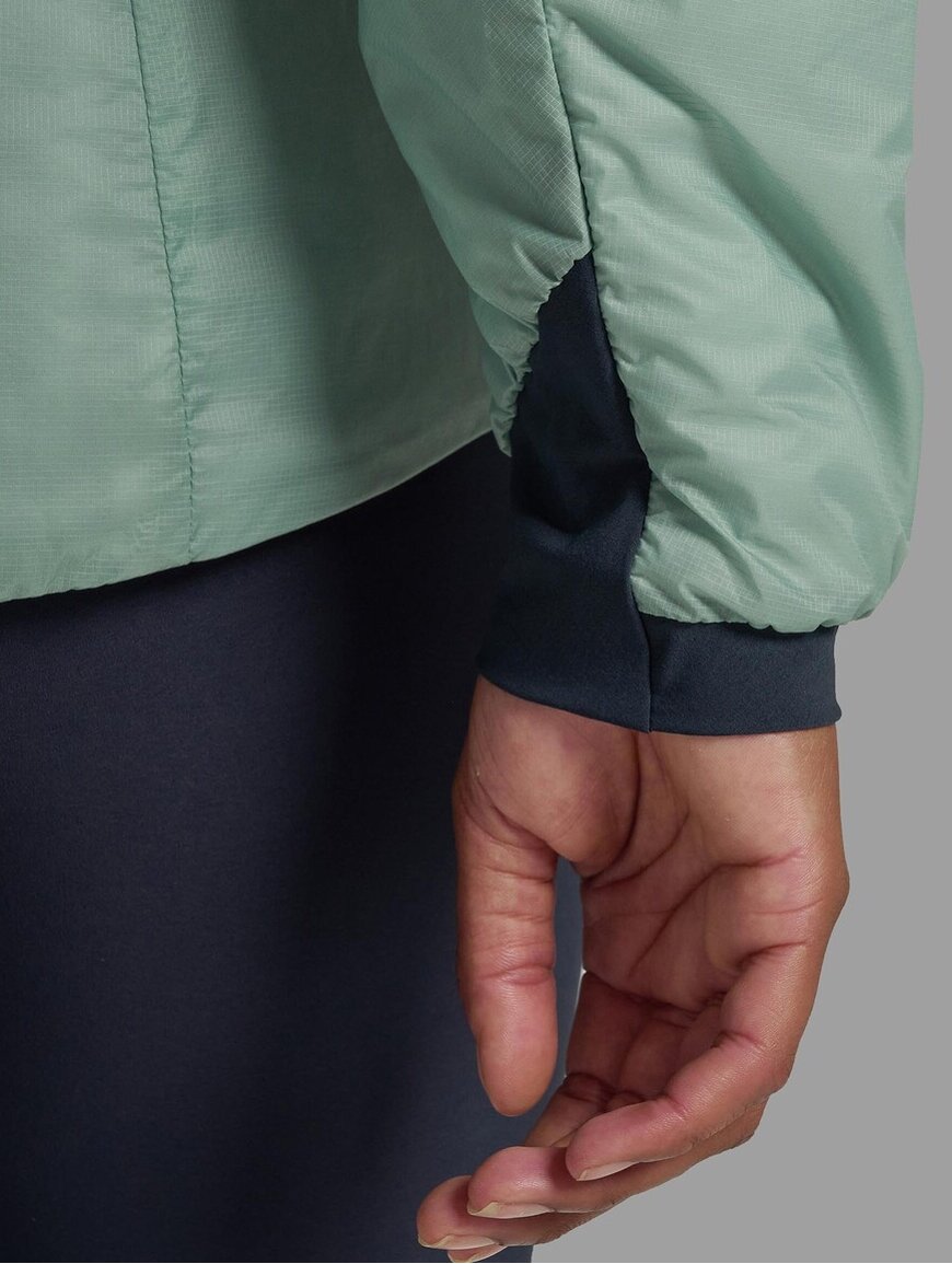 Куртка имеет продуманный женский крой, который точно повторяет линии тела и не сковывает движений. Капюшон PIVOT 2 плотно прилегает и регулируется по глубине, обеспечивая защиту от ветра. Два внешних кармана с молниями остаются удобными даже с рюкзаком, а нагрудный карман подходит для мелких вещей. Эластичные манжеты и регулировка по низу помогают сохранять тепло.