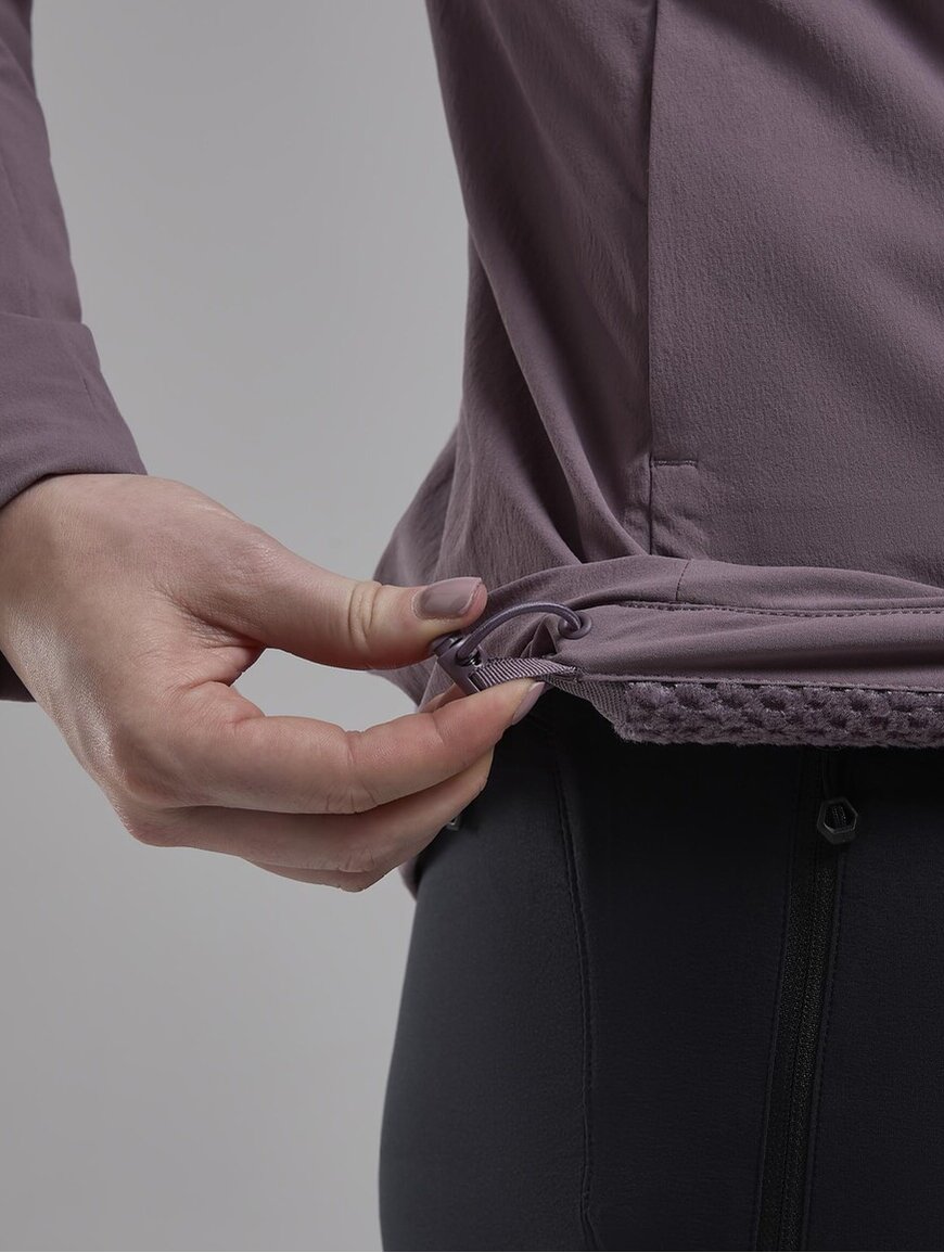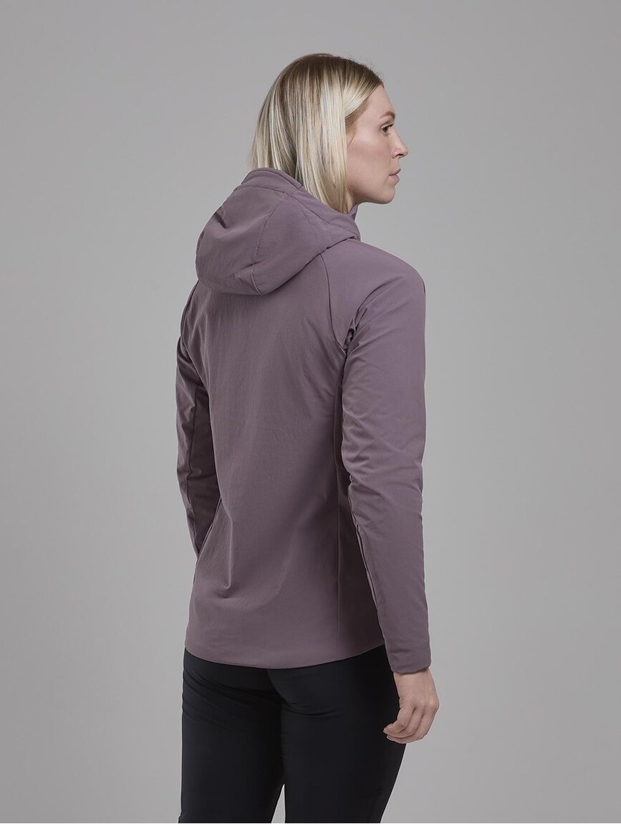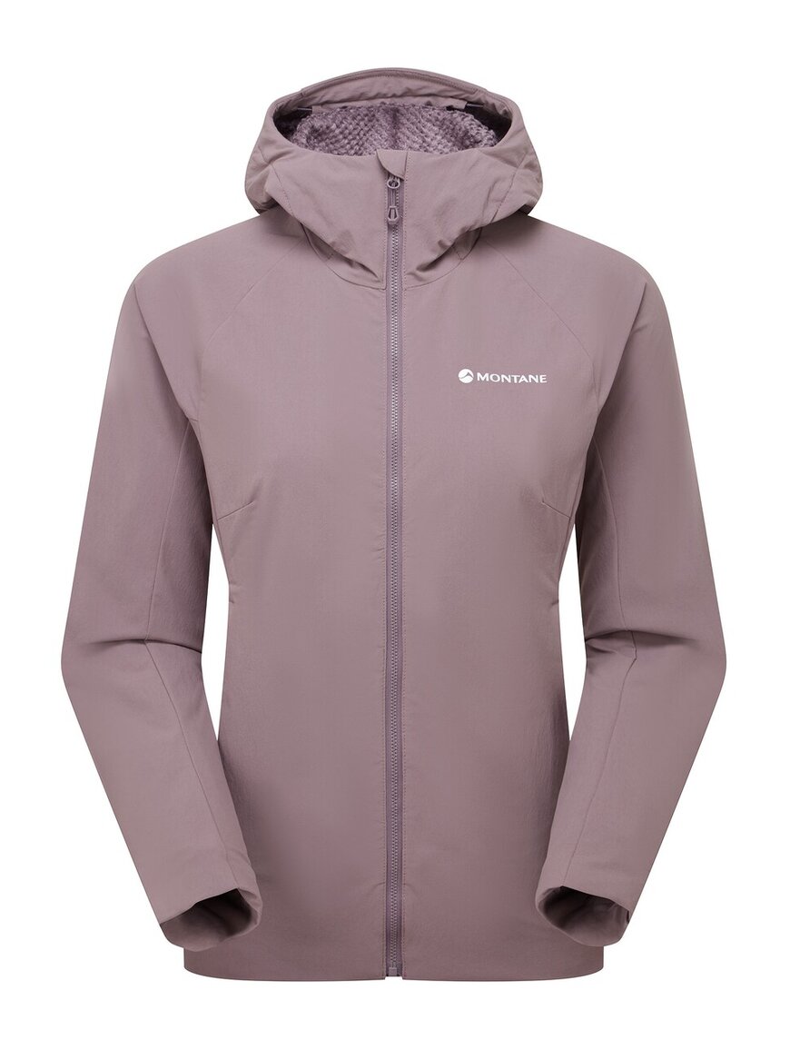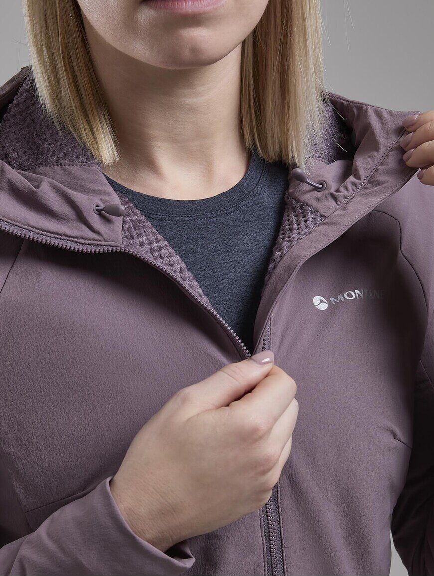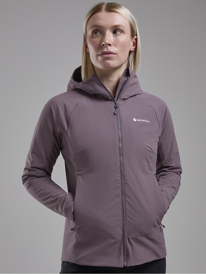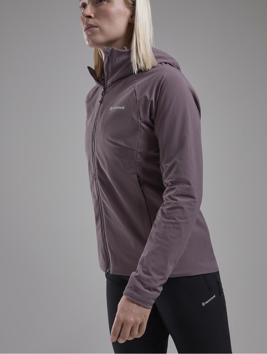 Montane MONTANE Khamsin Hoodie W - прочная и функциональная софтшелловая куртка, разработанная для активного использования в холодное время года. Она надежно защищает от ветра, хорошо пропускает воздух и сохраняет тепло во время движения в горах.