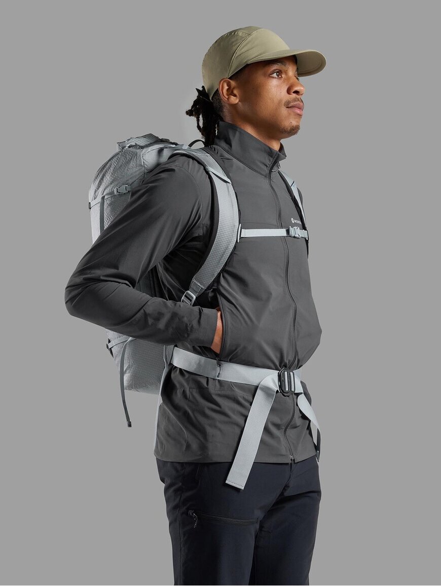 Удлиненный крой и минимальное количество швов обеспечивают удобную посадку и не натирают под рюкзаком. Два внешних кармана расположены выше линии ремня рюкзака или страховочной системы, поэтому остаются доступными во время движения. Нижний край можно подтянуть для более плотного прилегания или ослабить для лучшей вентиляции.