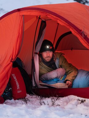 - Малый вес и тепло: палатка весит, как трехсезонные модели, и при этом она намного теплее благодаря внутренней палатке, почти полностью изготовленной из ткани. Такая конструкция позволяет удержать тепло, а во время катания или похода – сохранить мобильность.