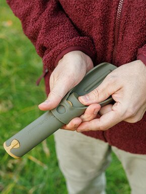 Модель изготовлена из армированного нейлона 66, обеспечивающего баланс между легкостью и стойкостью к нагрузкам. Конструкция хорошо выдерживает холодные условия и не теряет свои свойства даже при низких температурах. Полая ручка позволяет хранить внутри мелкие вещи, например салфетки или зажигалку, что придает функциональность. Благодаря продуманному дизайну, инструмент легко чистится и быстро приводится в порядок после использования. Это универсальный аксессуар, который пригодится в любом походе.